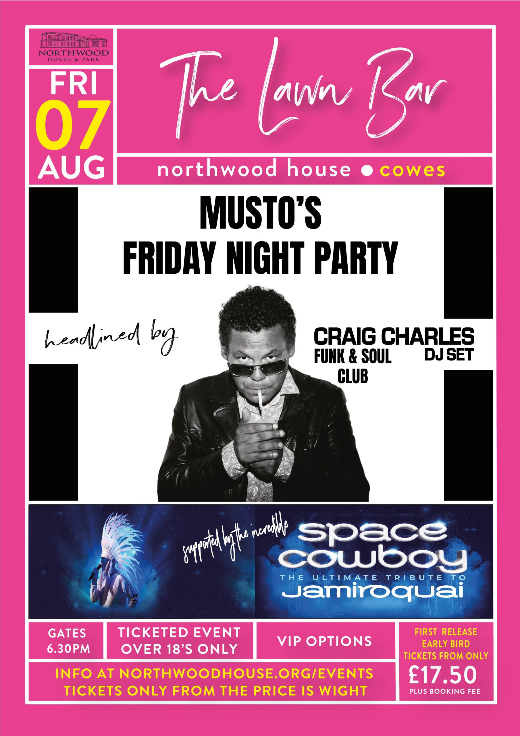 6.30pm: Gates open- please enter via the Northwood House Rotunda main entrance. Bars and Food outlets open