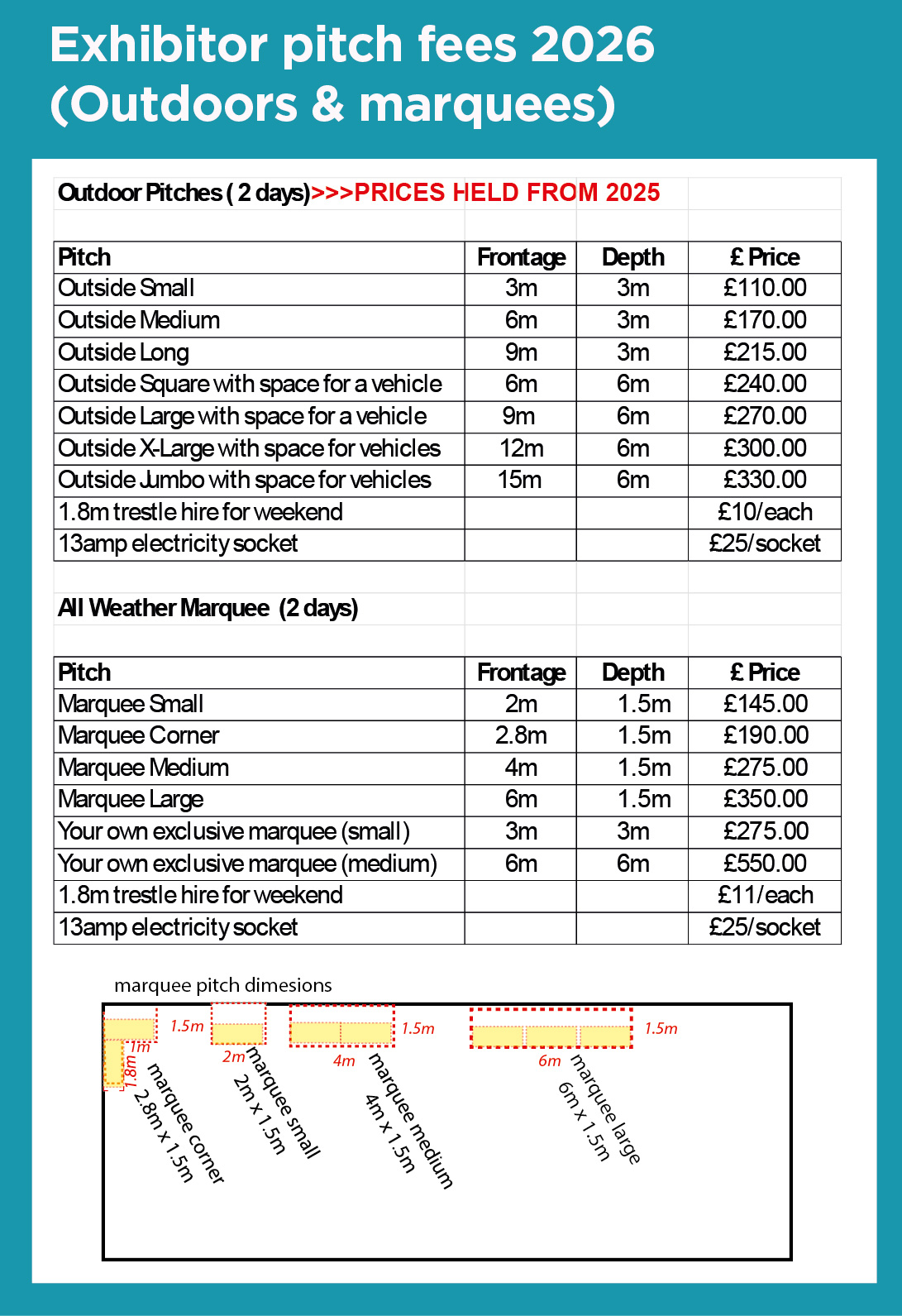 There’s lots to look forward to and exhibitors are now invited to take either an outdoor pitch for the event (providing their own shelters and gazebos), or in one of several all-weather marquees (provided by us, no need to provide your own gazebo).