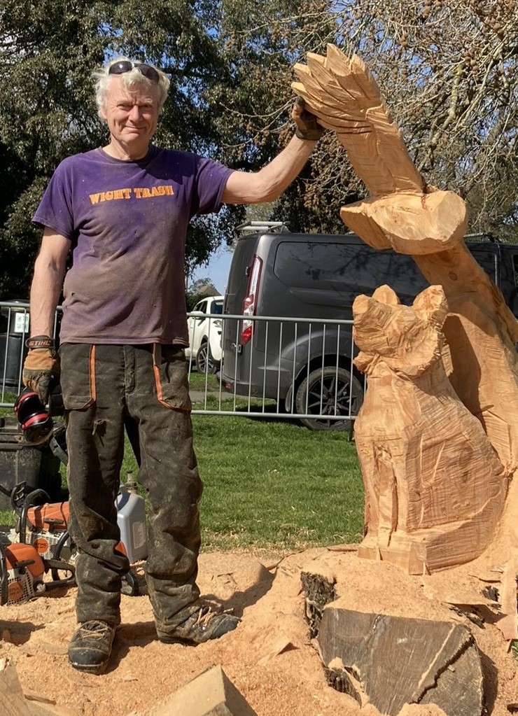 As a guide, the minimum sealed bid offer should generally be upwards of £750. This really only just covers the artists time, fuel and timber over a three day period, so lower bids would be deemed inadequate for a piece of original timber art. At the 2023 Isle of Wight Spring Art & Garden Fair, Paul carved an amazing sculpture named “The Fox and the Owl” which fetched £1500 at the auction at the end of the event and made an incredible addition to a local garden in Baring Road in Cowes. In 2024 Paul carved a sculpture featuring two squabbling Red Squirrels which fetched a similar price and now sits in pride of place in the owners Seaview garden.
