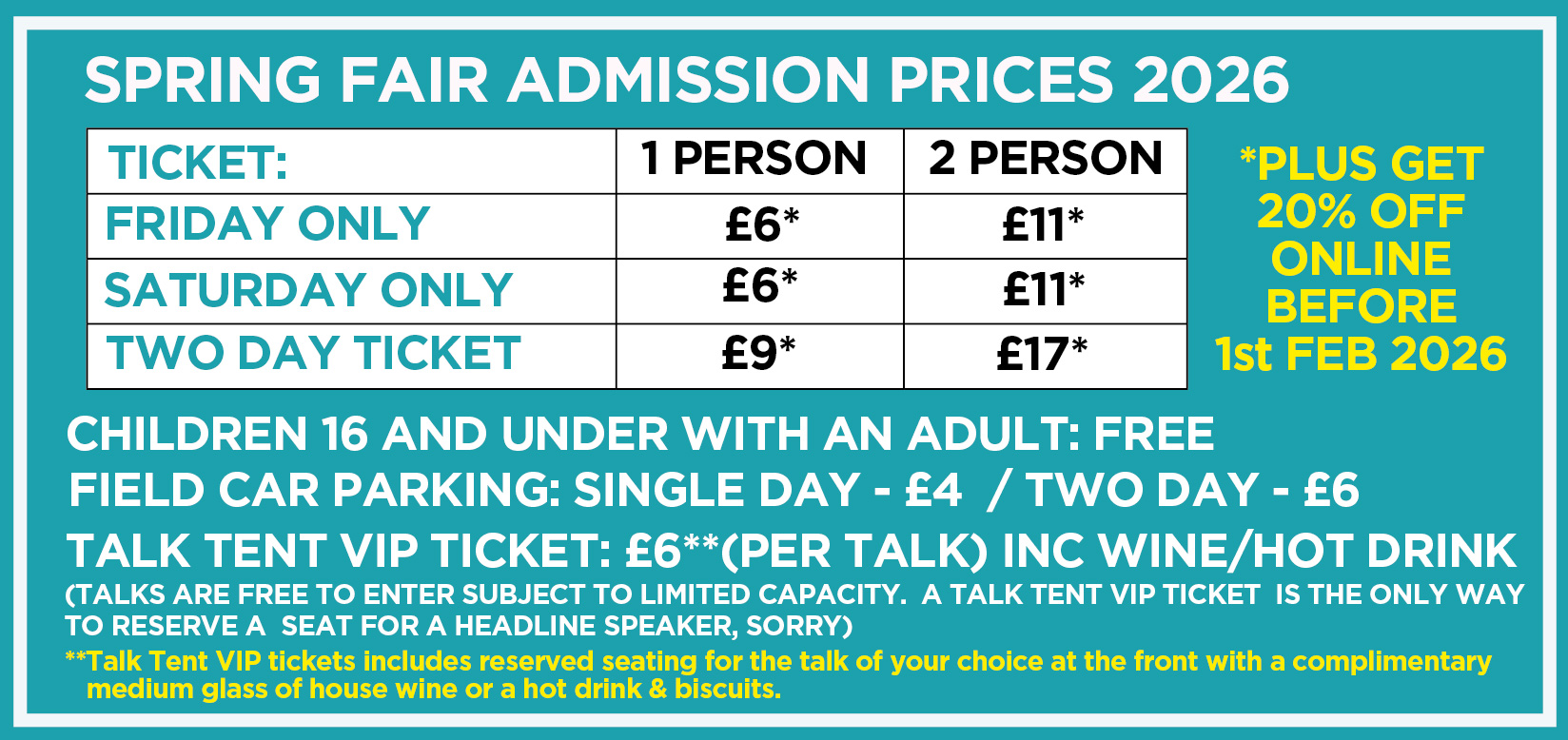 Single day tickets and discounted two day tickets can be purchased in advance below with the following tariff applicable for 2026, with 20% off for Early bird purchases before 1st Feb 2026 on admission tickets: